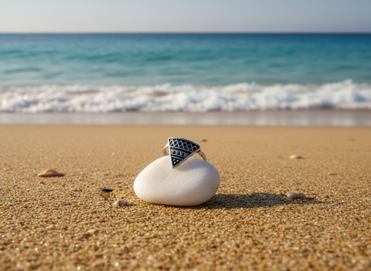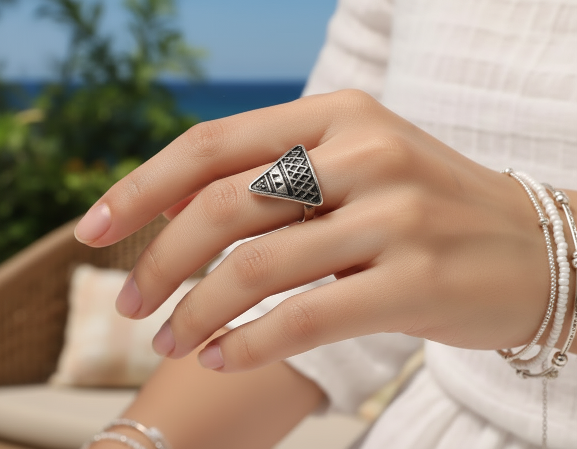 Ring with geometric drawings and an original triangle shape. It is a unique piece, do not miss the opportunity to get it.