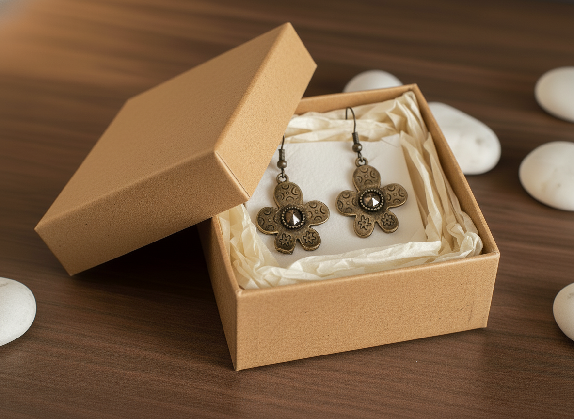 Hippie or boho style flower-shaped earrings. They are shaped like a daisy flower, with small flowers engraved on its petals. It is a limited edition and timeless piece