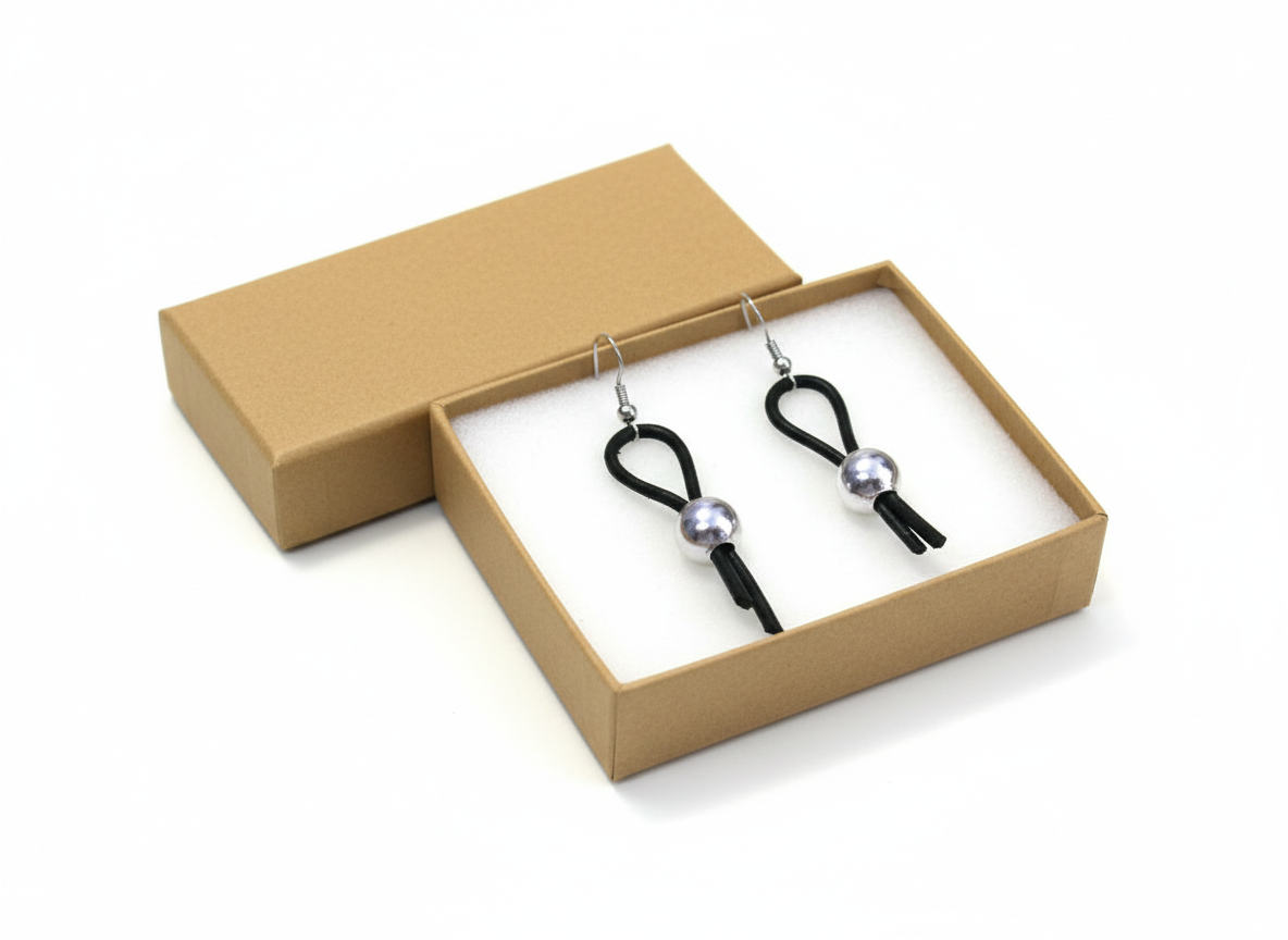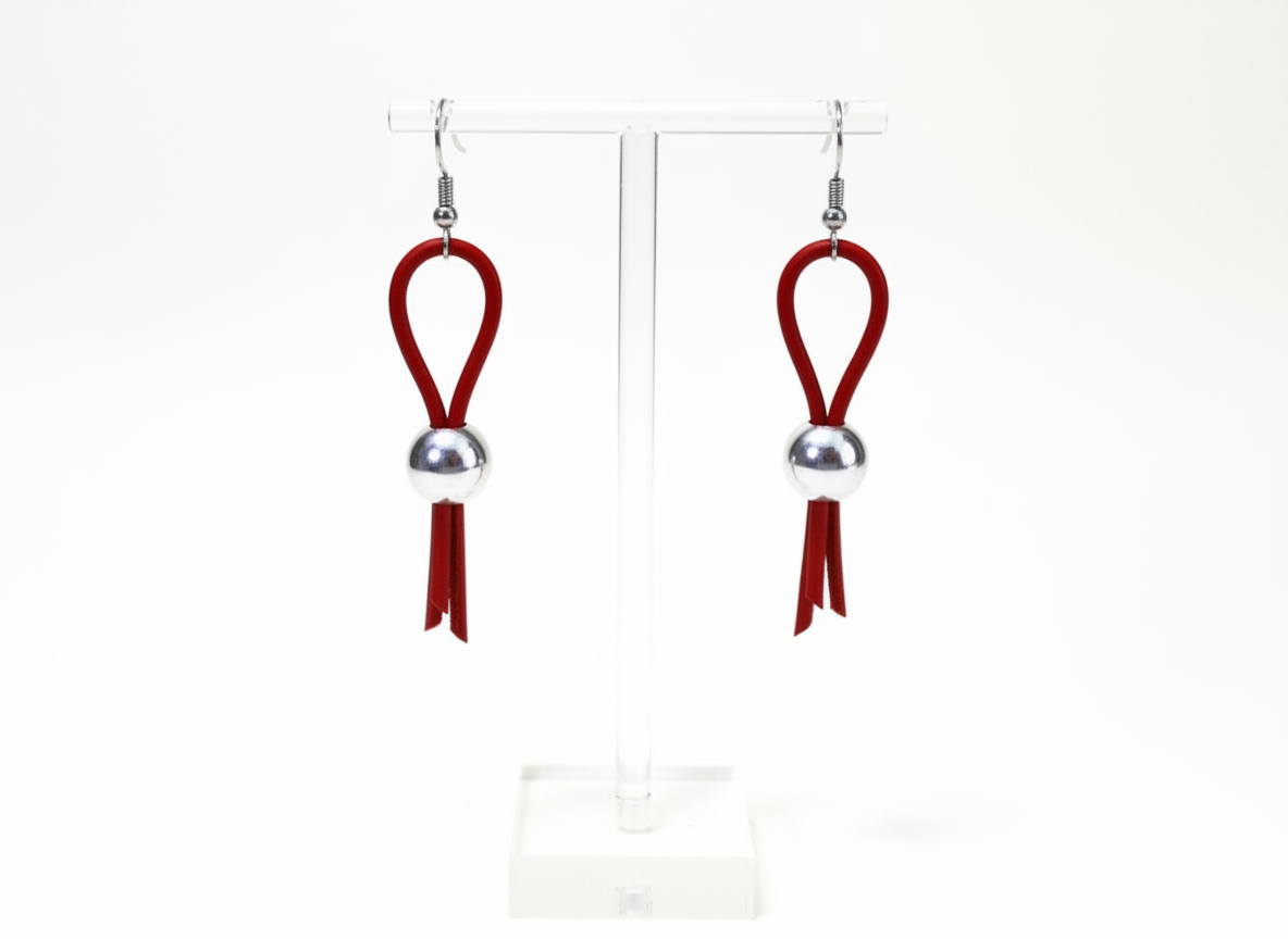 Earrings made of leather and silver or surgical steel hooks, adorned with a metal ball.