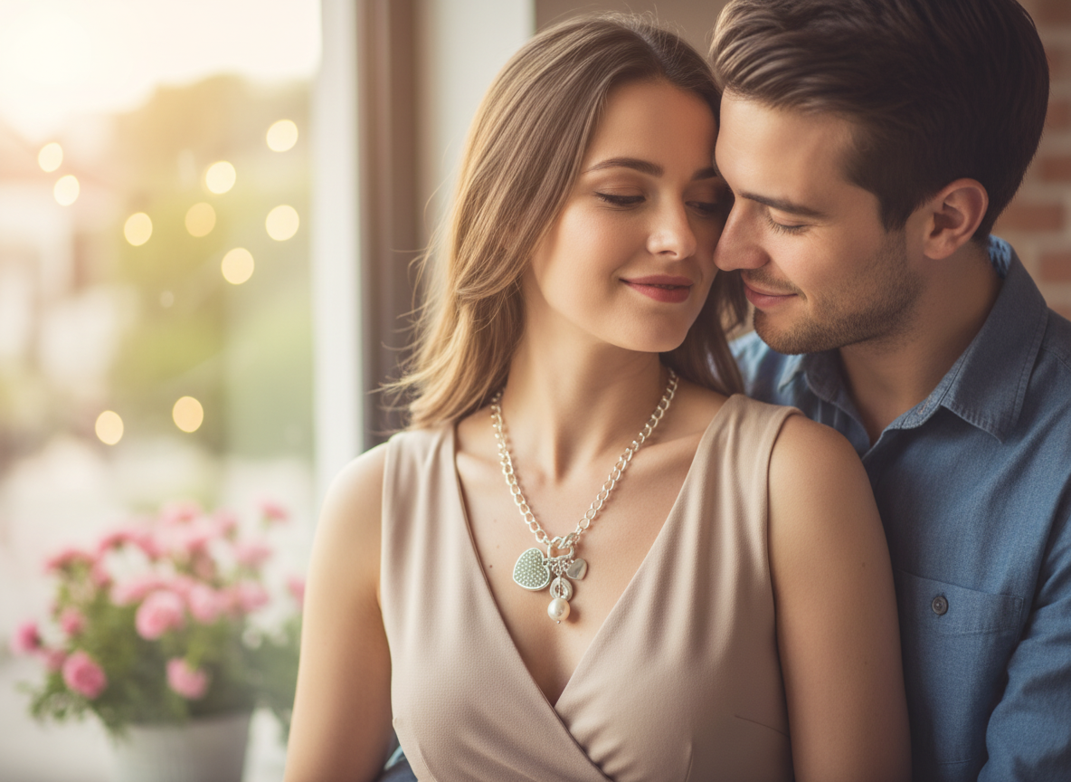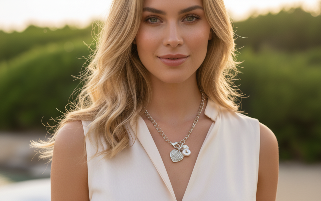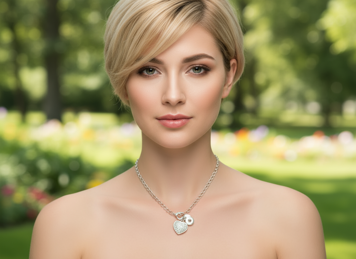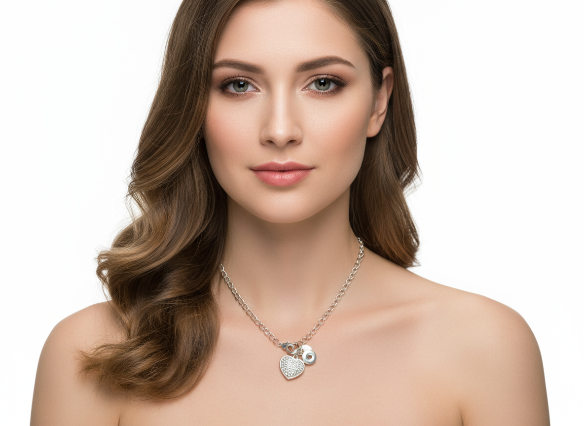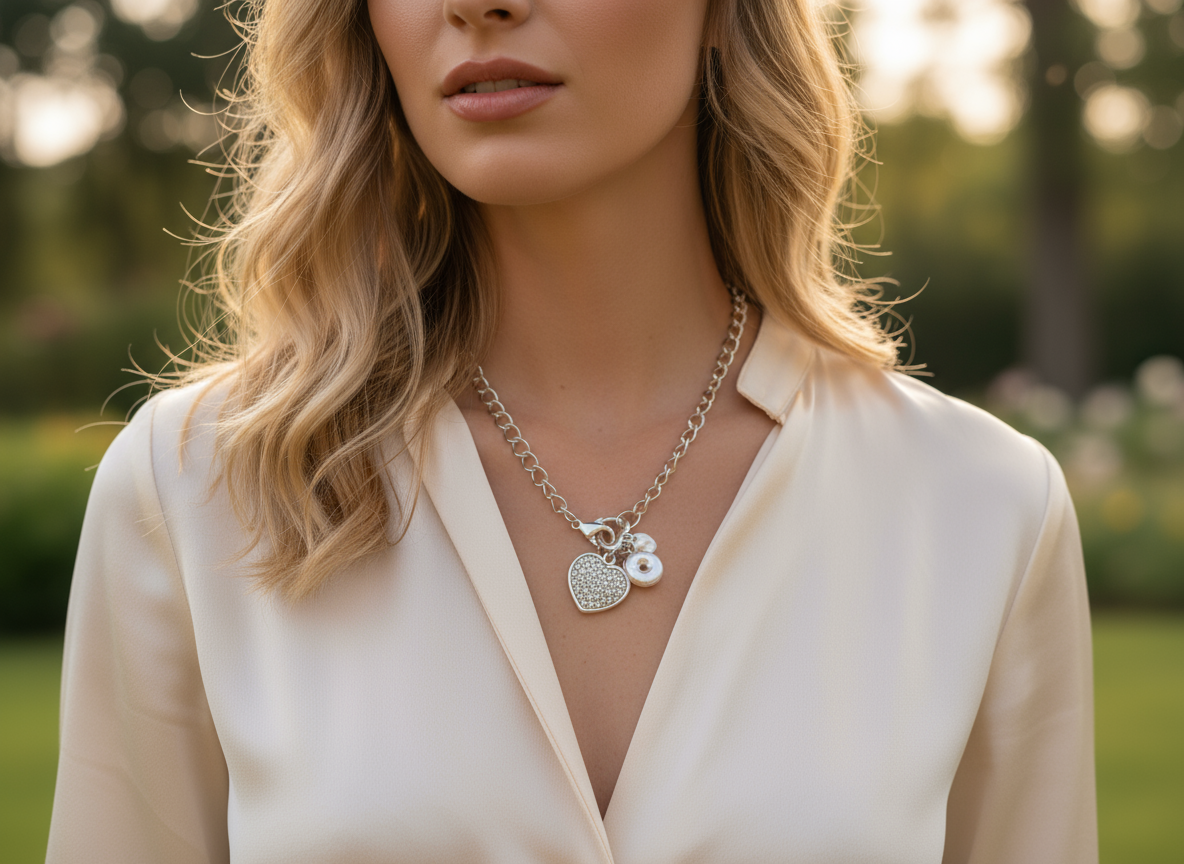 Simple and romantic necklace with a chain and hearts. The clasp is in the shape of a heart and is adorned with a second heart with shiny rhinestones. It is very romantic and it will be a beautiful gift, simple but it does not go unnoticed
