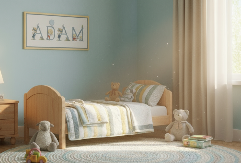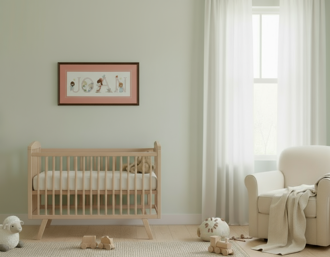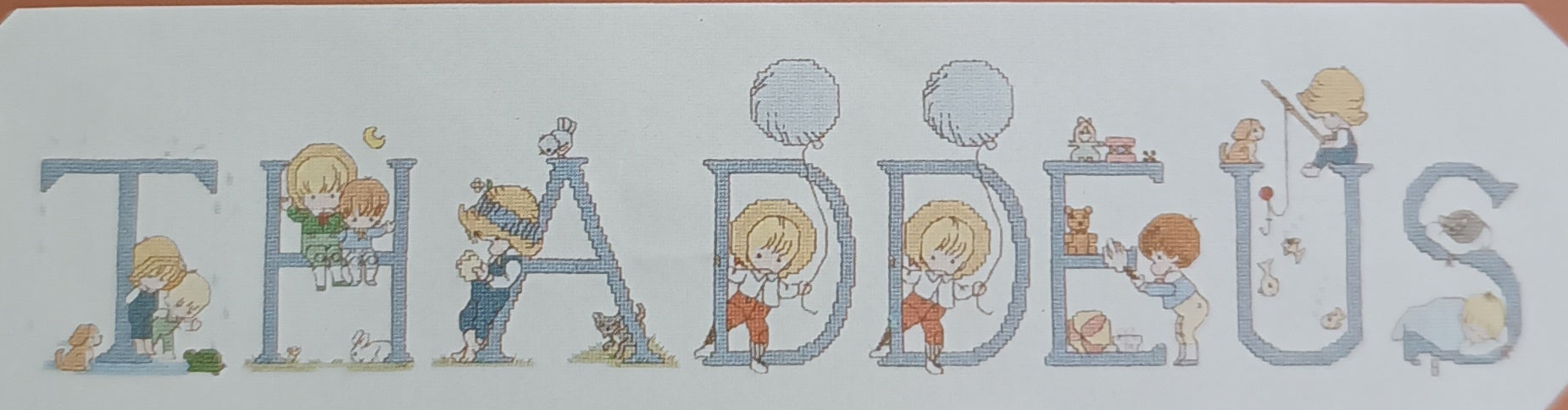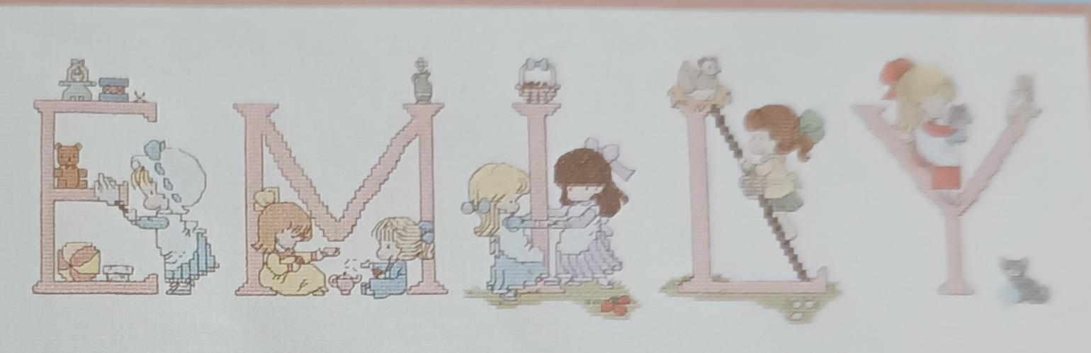 Graphic and pattern of the complete alphabet of 52 cross-stitch letters with designs for boys and girls