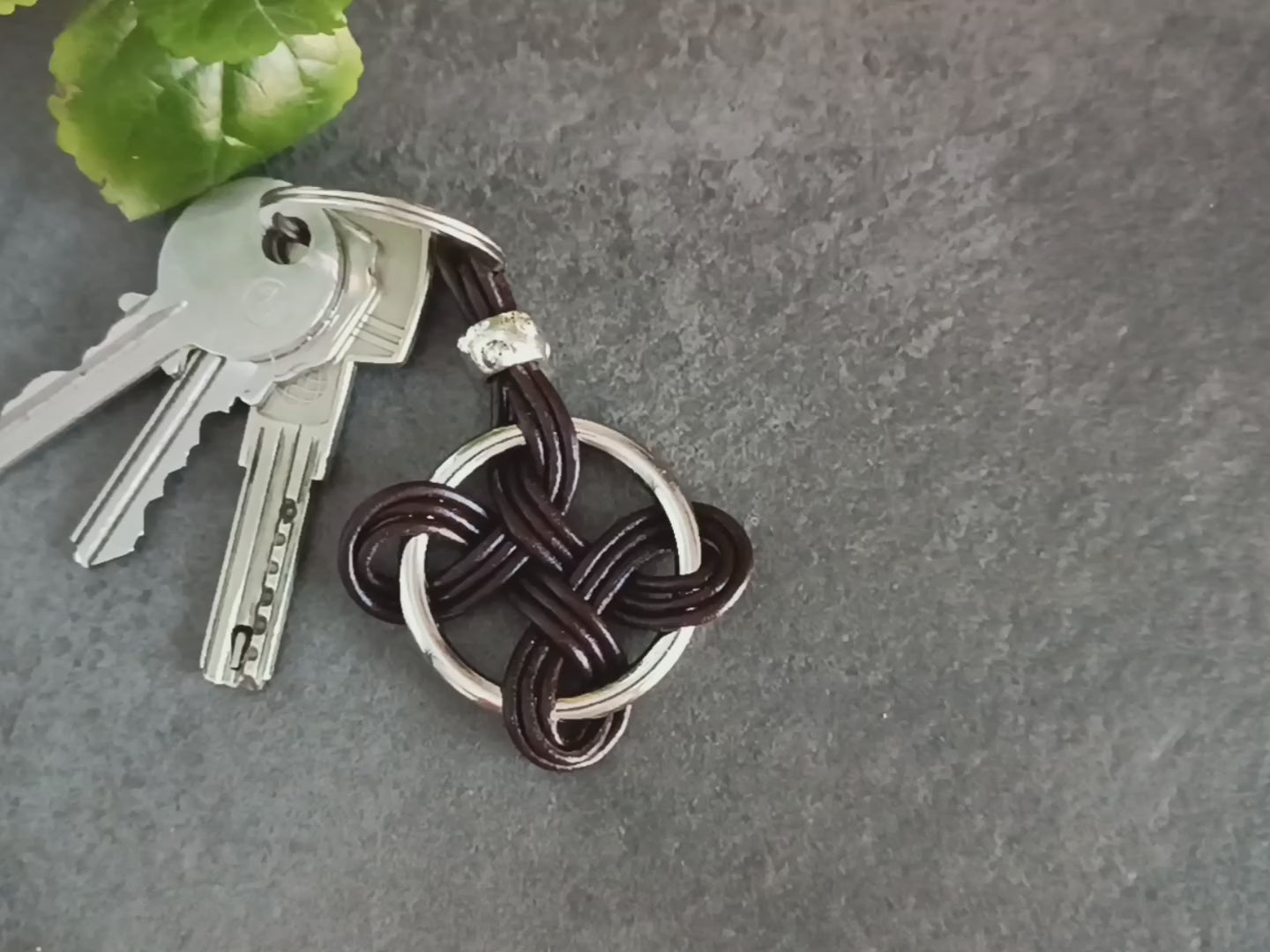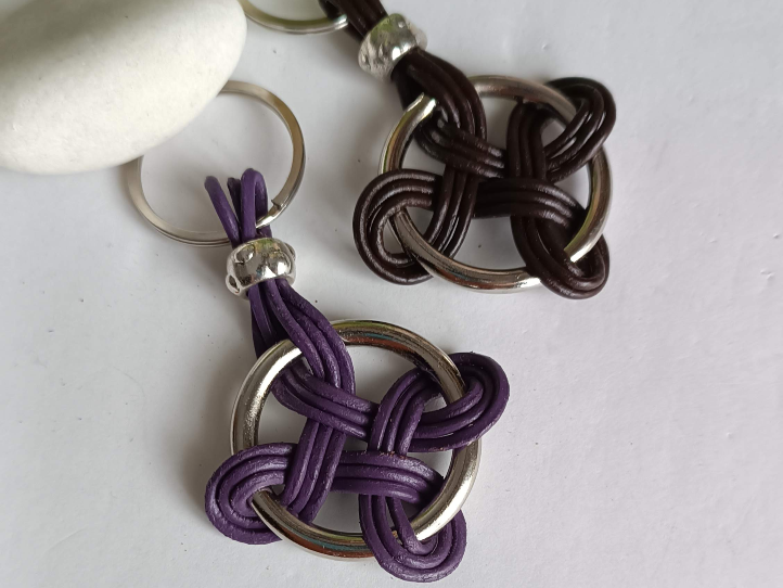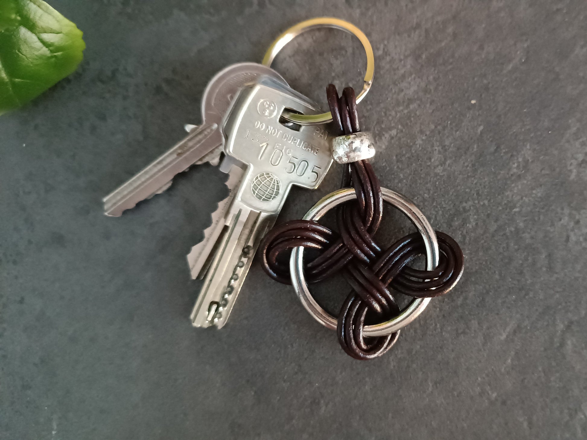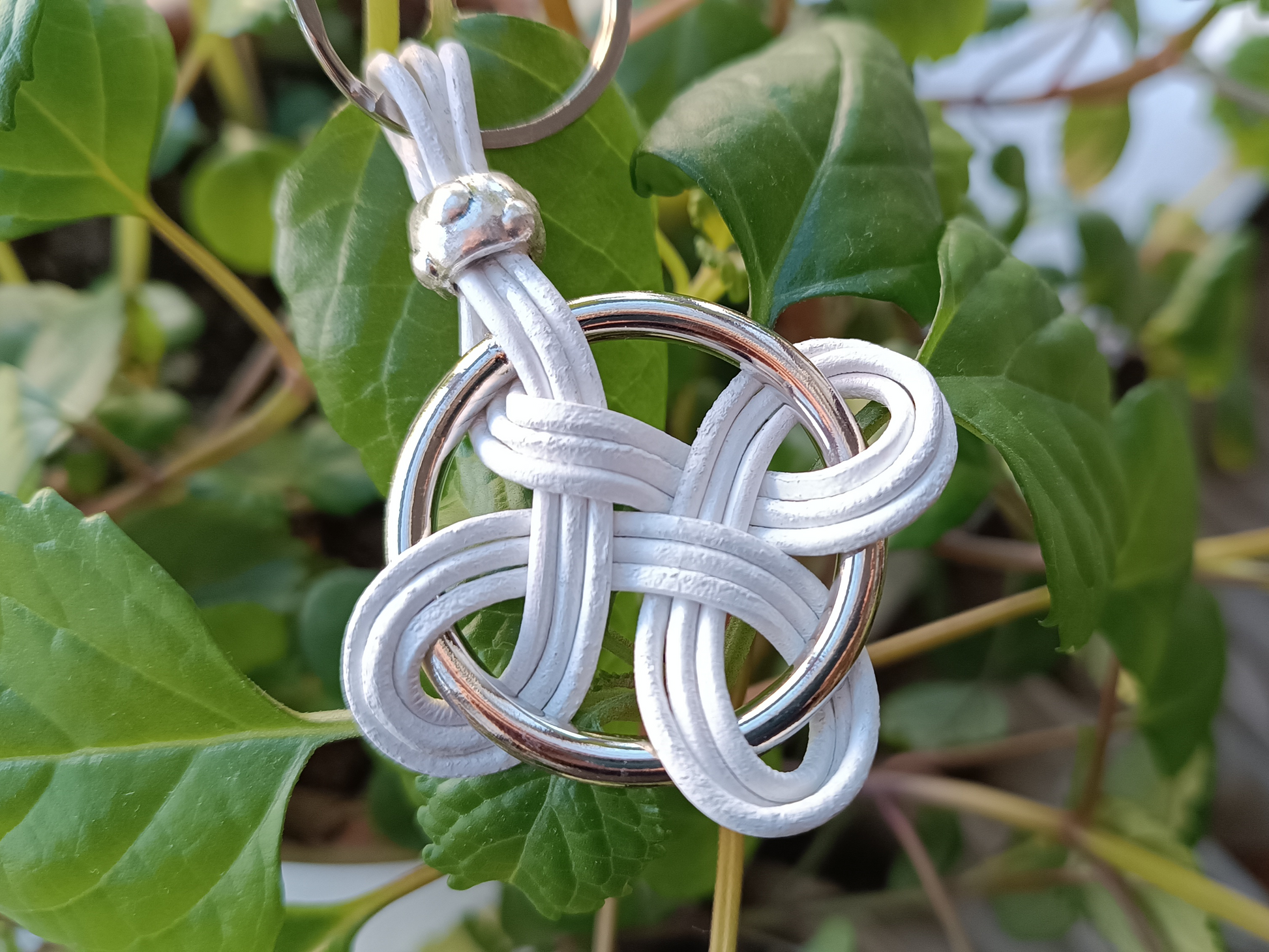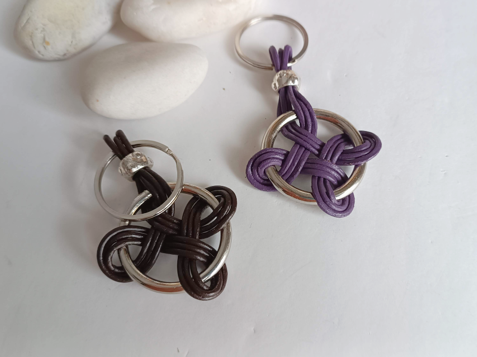 Key ring with the witches' knot, made of steel and leather. It has a steel circle in which are framed the four arms of the knot made of leather.