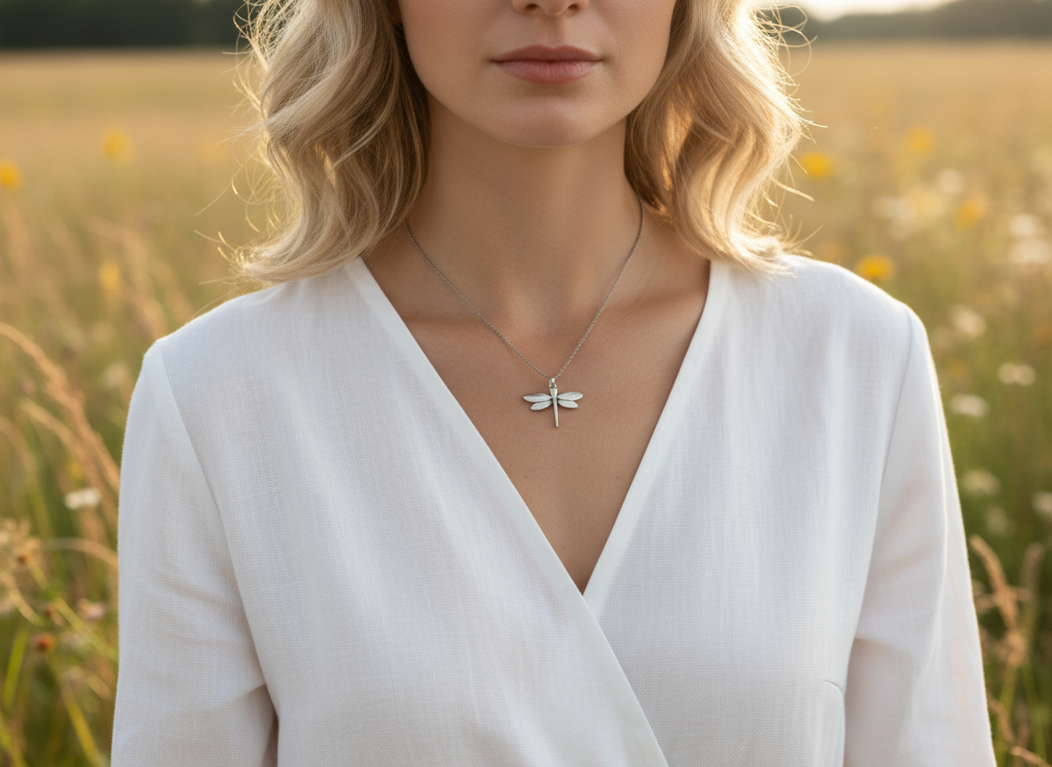 Es una collar corto de estilo minimalista. Lleva un colgante con una delicada libélula de color plateado.