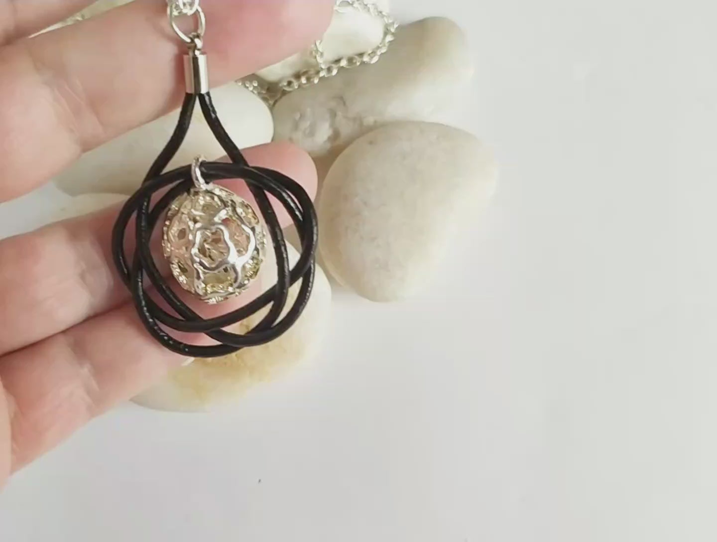 Un colgante con llamador de ángeles en plata tibetana enmarcado en un circulo de vida celta hecho a mano en cuero negro.