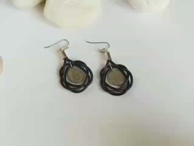 Pendientes largos de cuero con nudo celta circulo de la vida. El adorno central que está grabado con símbolos étnicos muy originales. Es de estilo Bohemio y hippie, muy originales y únicos para un look mas desenfadado. Hechos totalmente a mano en mi taller de Galicia