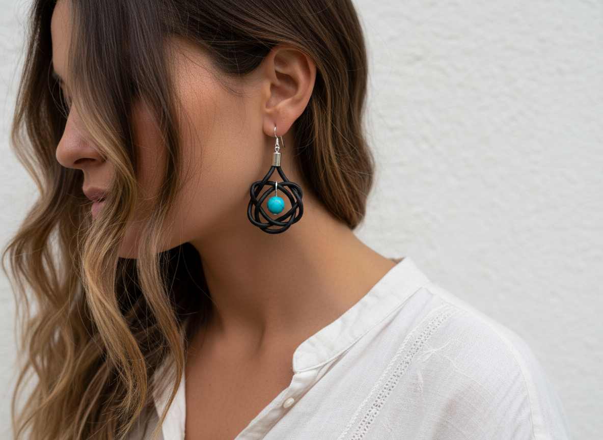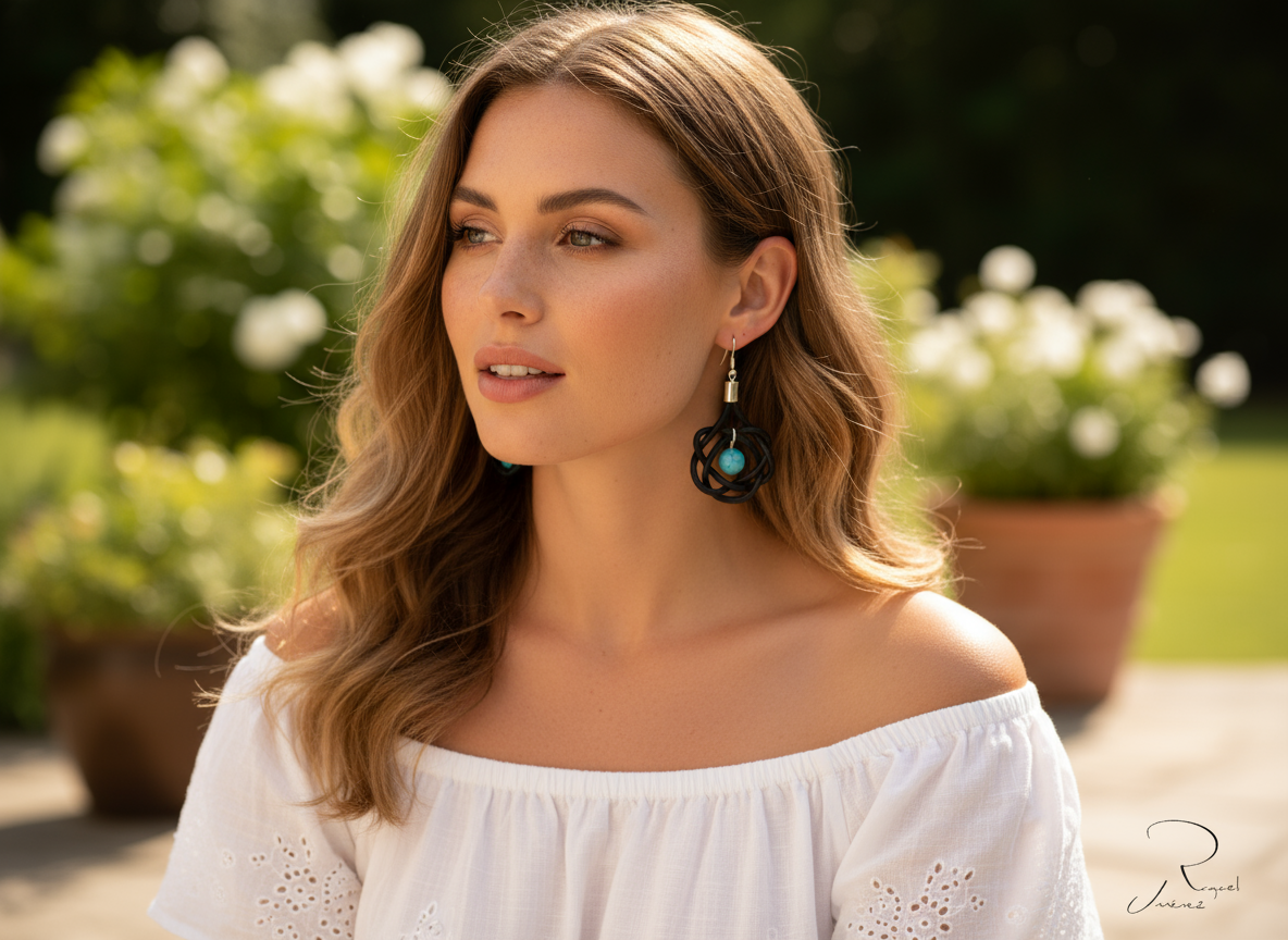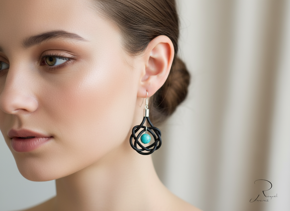 Pendientes largos con nudos circulo de la vida de cuero y bola central turquesa. Son unos pendientes de estilo muy bohemio y desenfadado, están hechos toralmente a mano en mi taller de Galicia