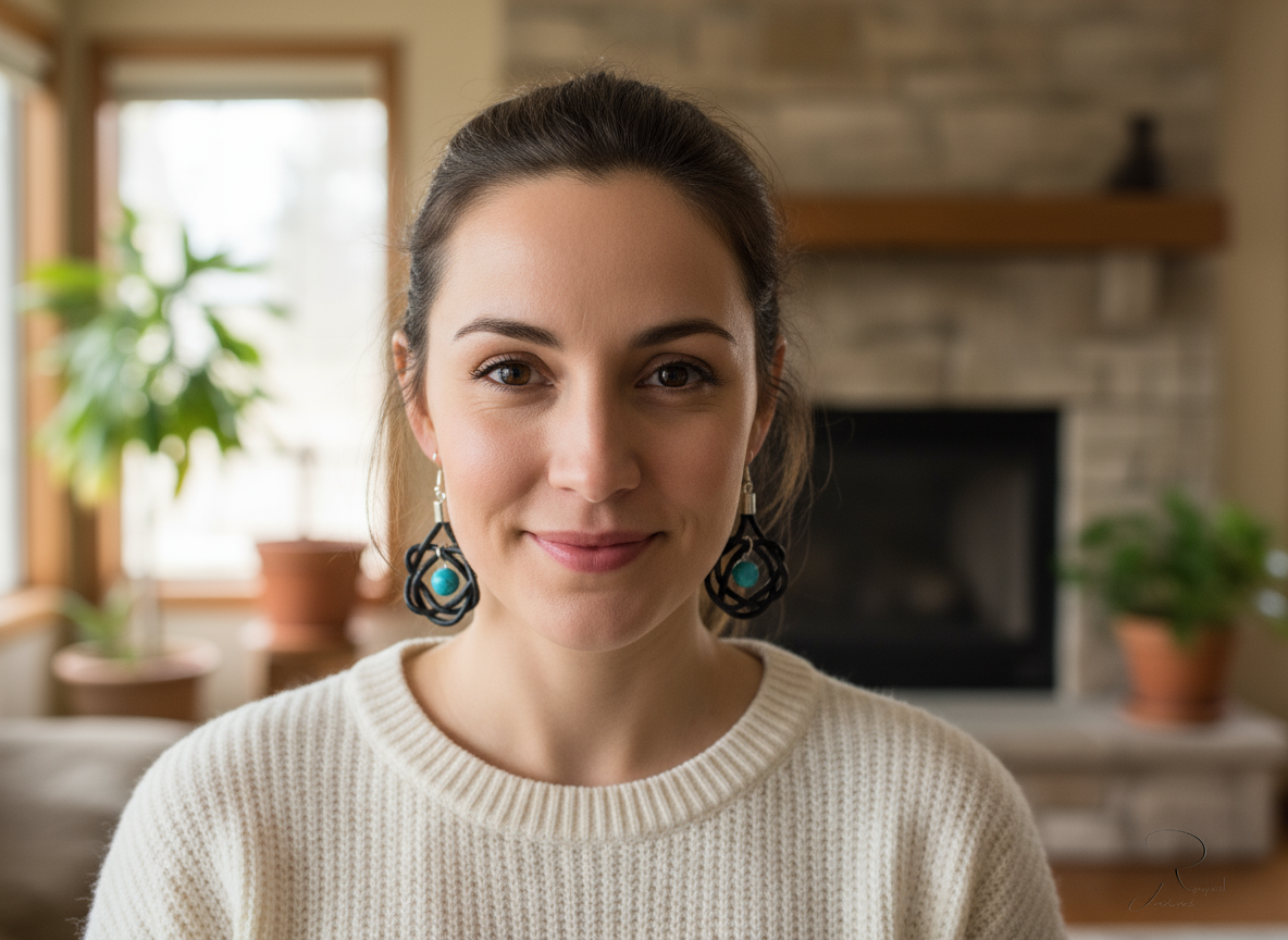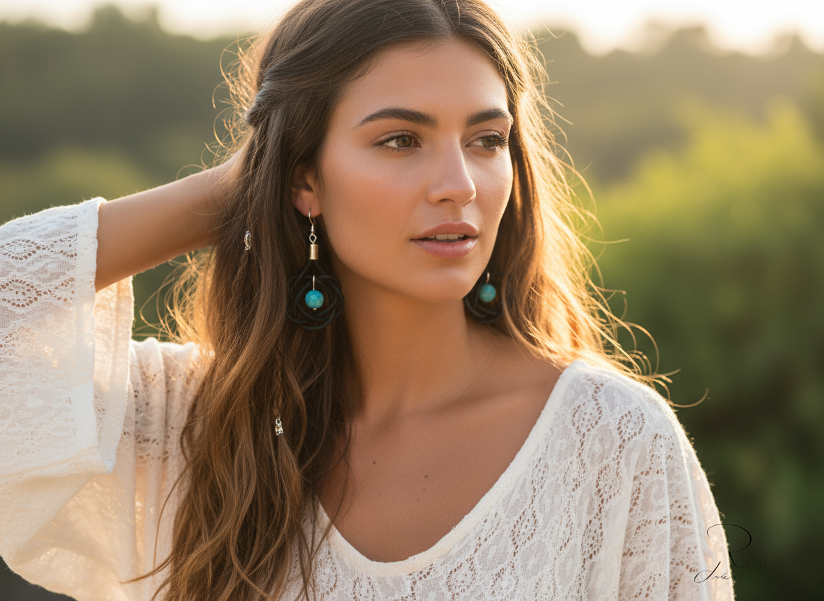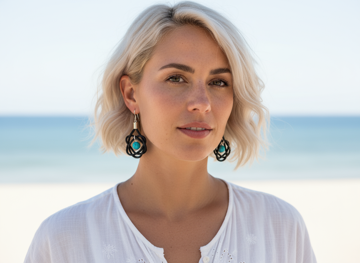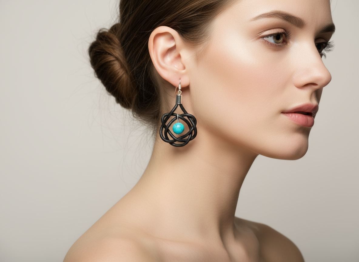 Pendientes largos con nudos circulo de la vida de cuero y bola central turquesa. Son unos pendientes de estilo muy bohemio y desenfadado, están hechos toralmente a mano en mi taller de Galicia