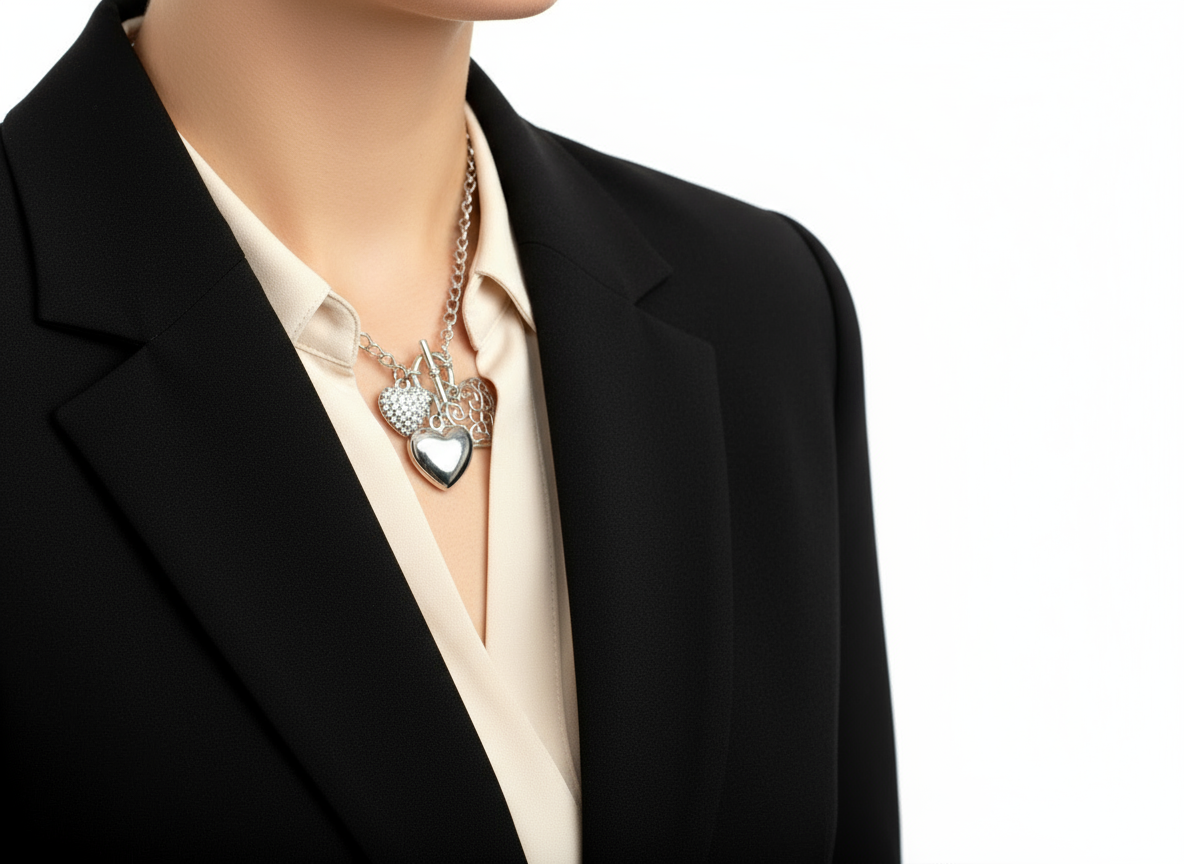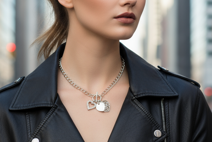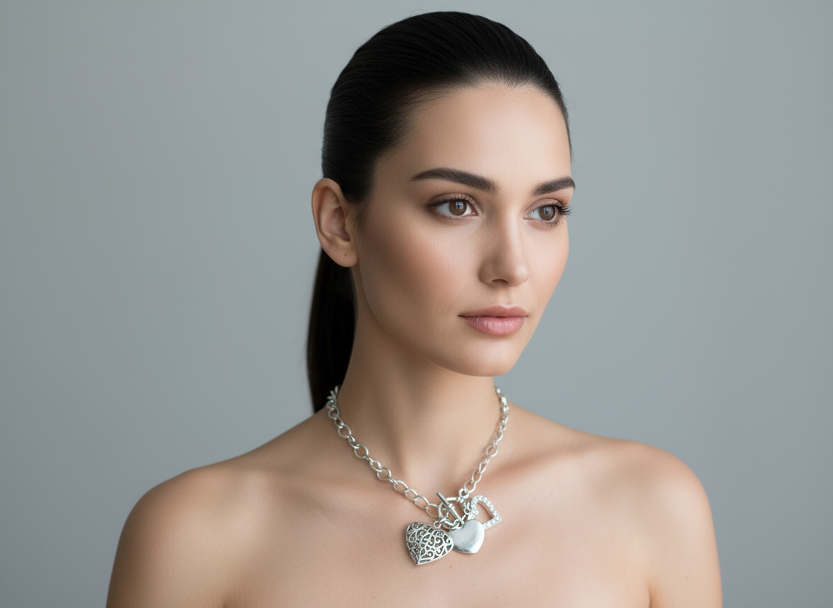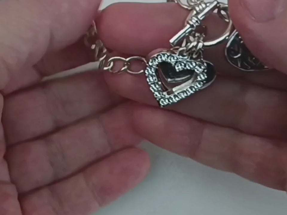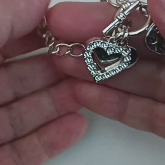 Bracelet chaîne romantique avec décorations de cœur de différentes textures et tailles, avec fermeture à crochet.