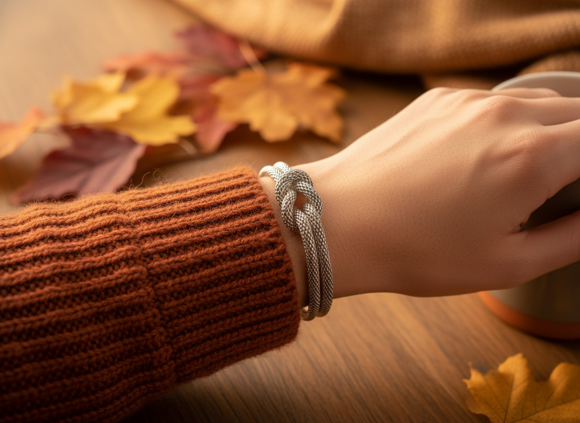 Bracelet avec noeud nautique ou marin, composé d'une chaîne en métal avec tressage rond.
