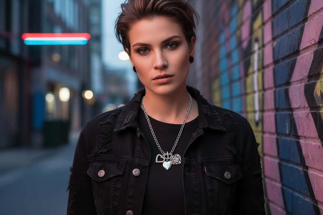 Collier romantique à chaîne orné de cœurs de différentes textures et tailles, avec fermoir à crochet.