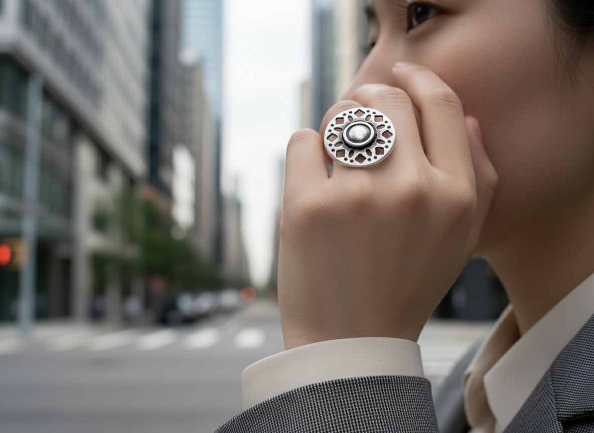 Este anillo presenta un estilo étnico distintivo y está diseñado para ser ajustable, lo que le hace perfecto para adaptarse cómodamente a diferentes tamaños de dedo.
