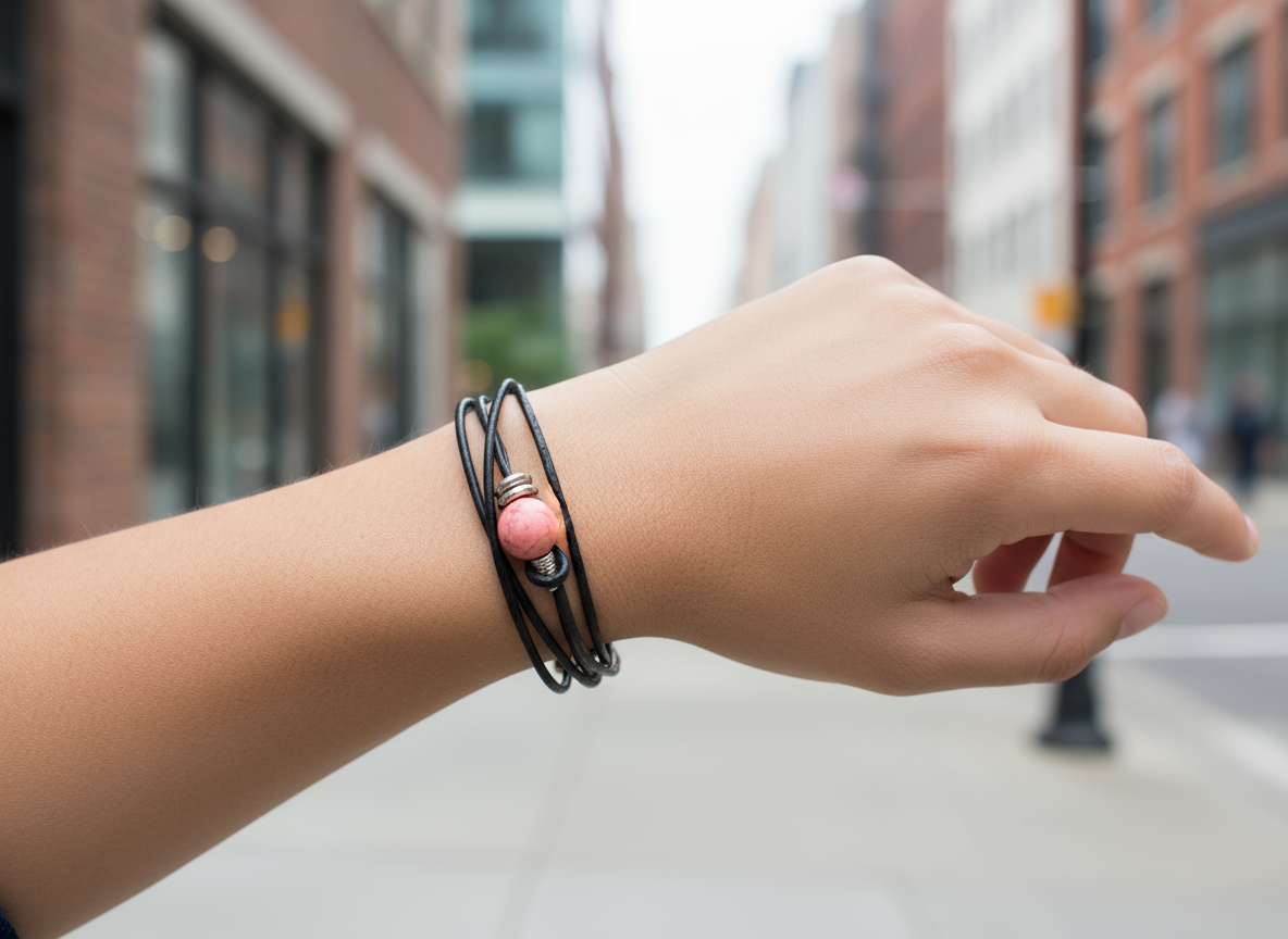 Pulsera de dos vueltas de cuero negro con una bola de coral natural que hace de cierre. Es una pulsera de doble vuelta, muy elegante y discreta que se puede poner en cualquier ocasión, la bola de coral le da un toque especial. El coral de extracción sostenible.